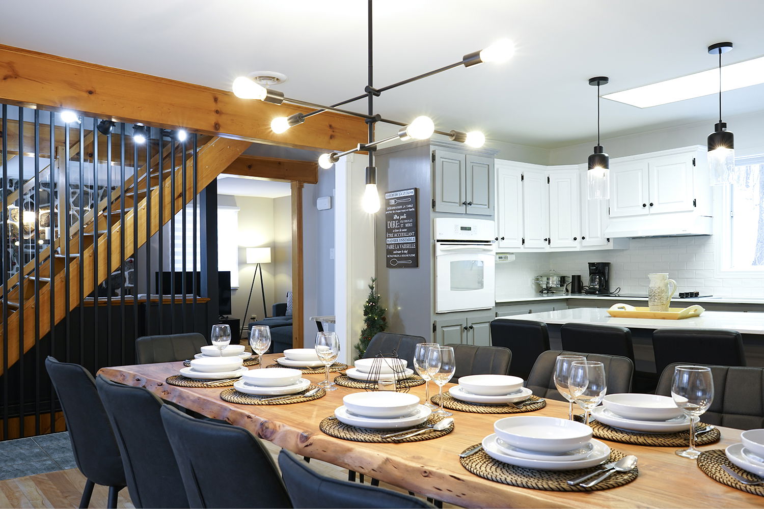 Cuisine complète avec grand îlot, lave-vaisselle, frigo, ensemble d’assiettes et tout ce qu’il faut pour ceux qui aiment cuisiner et une grande table pour 10+ personnes. Aussi BBQ disponible à l'année.